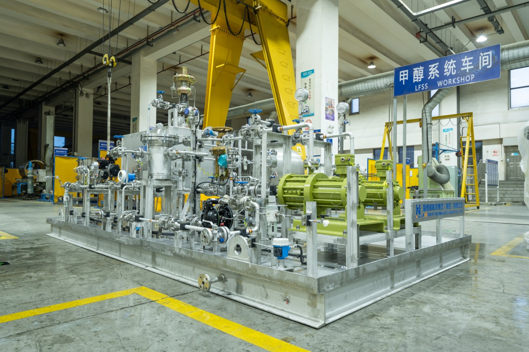 中船發(fā)動機(jī)有限公司大柴公司甲醇雙燃料試車平臺,配備了由海德威科技集團(tuán)提供的涵蓋甲醇燃料供給模塊、加注儲存系 統(tǒng)、輔助換熱系統(tǒng)、氮?dú)庀到y(tǒng)以及控制安保系統(tǒng)等核心模塊在內(nèi)的一站式系統(tǒng)解決方案。該方案及其配套模塊由海德威自主 研發(fā)和生產(chǎn),是國產(chǎn)首個(gè)成功應(yīng)用的甲醇燃料供給系統(tǒng)成熟解決方案。